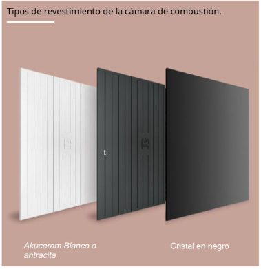 Disponible con diferentes acabados interiores: Akuceram (color blanco o grafito) y cristal negro, y 6 configuraciones de cristal (frontal, esquina izquierda, esquina derecha, 3 caras tipo C, 3 caras tipo U y 2 caras.
