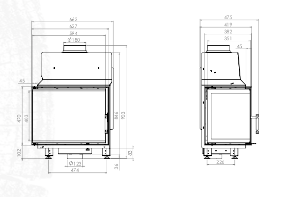 Insertable. Puerta SIMPLE. Sistema de cristal limpio. Gran visión de cristal vitroceramico resistente al calor. Puerta de acero. Dos cortinas de aire superior e inferior. Amplio contenedor extraíble de cenizas. Patas regulables 4 cm de rango. Deflectores cerámicos. Sistema de postcombustión. Amplia cámara de combustión. Entrada de aire exterior.