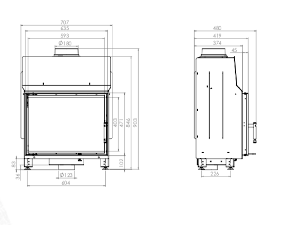 Insertable. Puerta SIMPLE. Sistema de cristal limpio. Gran visión de cristal vitroceramico resistente al calor. Puerta de acero. Dos cortinas de aire superior e inferior. Amplio contenedor extraíble de cenizas. Patas regulables 4 cm de rango. Deflectores cerámicos. Sistema de postcombustión. Amplia cámara de combustión. Entrada de aire exterior.