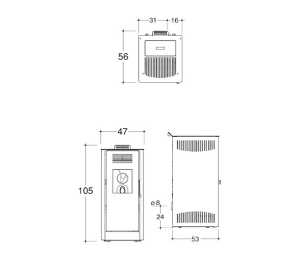 Dimensiones cuerpo ventilado por aire caliente de leña+tapa: L48 x P51 x H109cm