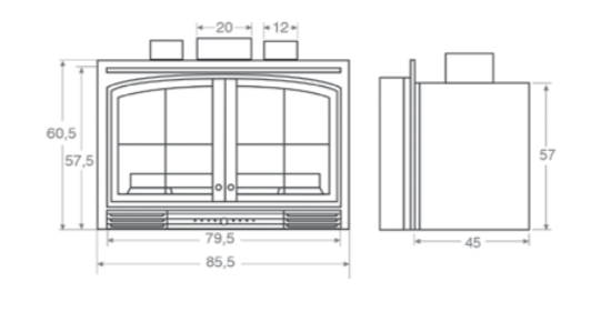Hogar de leña de Hierro fundido y Acero. Rendimiento mejorado, diseño elegante y precio asequible. Incluye ventiladores con 2 velocidades. Con salidas aire canalizables. Marco opcional. Salida de humos superior.